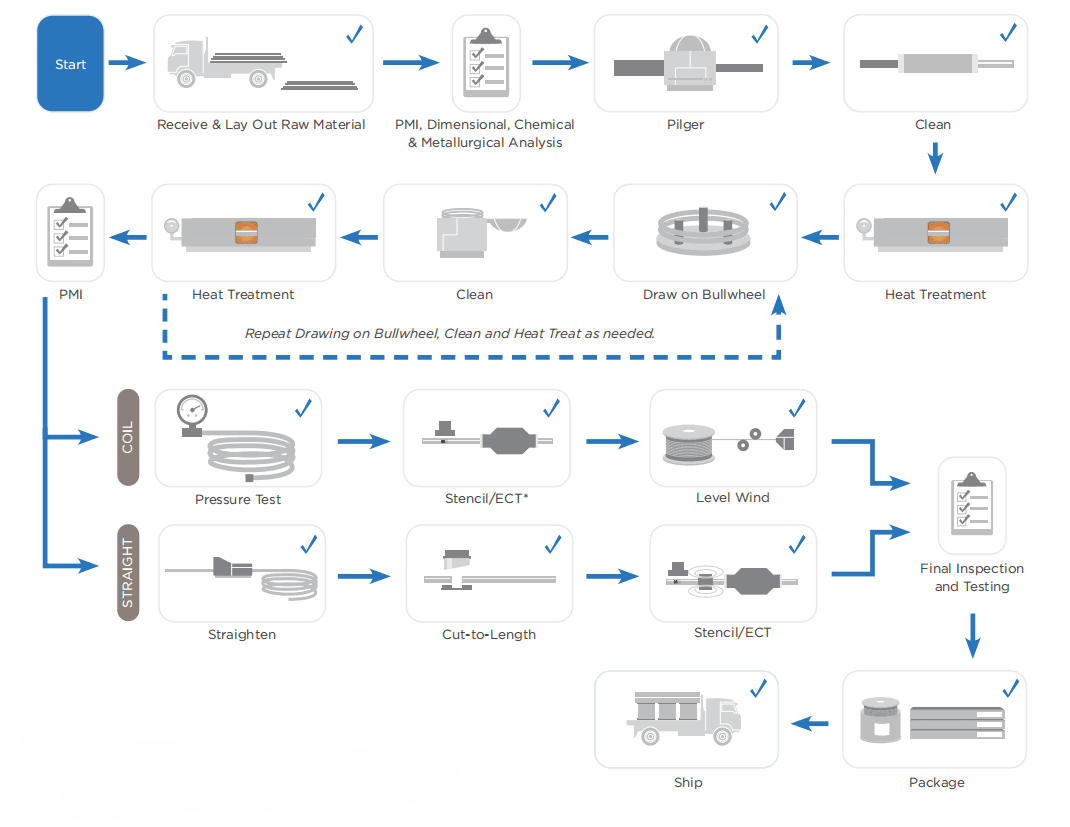 Toko TECH seamless coiled tubing is manufactured using advanced hot extrusion combined with cold working techniques, ensuring product uniformity and high performance. The main process flow is shown in the chart below: